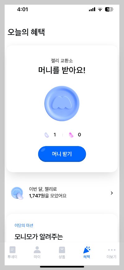 모니모에서는 '젤리'를 주는데, 돈을 대신해서 젤리를 줍니다. 젤리를 바로 돈으로 교환이 가능하며, 출금도 바로 가능합니다.