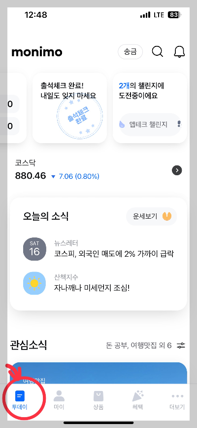 가입 이후에는 로그인하면 하단에 투데이에서 나의 젤리 현황과 진행 중인 이벤트를 확인할 수 있습니다.